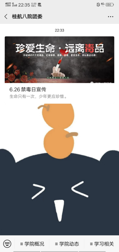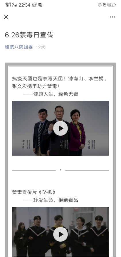 开展一次禁毒网络宣传活动。学院利用微信公众号、QQ群等网络宣传阵地,对毒品的种类、形状、颜色和吸食毒品对人体造成的巨大危害等防毒知识进行广泛宣传,进一步提高学生们树立“珍惜生命,拒绝毒品”的意识,营造了浓厚的禁毒、防毒宣传氛围。