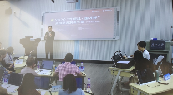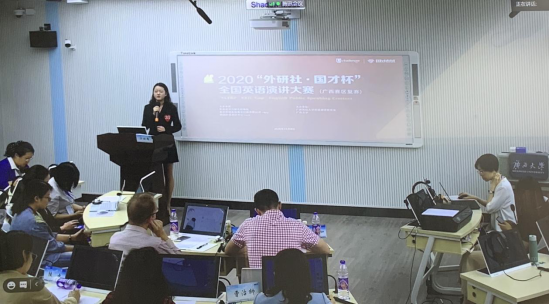 “外研社·国才杯”全国英语演讲大赛是由教育部高等学校大学外语教学指导委员会、教育部高等学校英语专业教学指导委员会联合主办的全国性英语演讲赛事。经过一轮网络海选,全区32所高校共有41名优秀选手获得在广西大学举行线下比赛资格。选手们在比赛中 “八仙过海、各显神通”,给观众带来了一场场华丽的英语口语盛宴。黄潇涟和郑慧颖同学在比赛中脱颖而出,以其扎实的英语口语应用能力、缜密的逻辑思维和真挚的演讲情感征服了评委,均获得二等奖的好成绩。