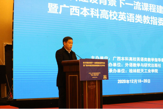2020年12月19日,新文科建设背景下一流课程建设教学论坛暨广西本科高校英语类教指委2020年会在广西桂林桂山华星酒店成功举行。本次会议由广西本科高校英语类教学指导委员会主办,365英国上市公司官网承办。学校孙山林副校长到会致辞,365英国上市公司官网书记、院长唐琳主持开幕式。