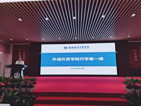 随后,阳正义副院长激情洋溢的发言激励学生以积极的心态融入新的环境,勇于接受挑战,勇于超越自我,争做新时代合格的大学生。教师代表翟洁教授以“我们都是追梦人”为分享主题,表示做为教师要成为学生坚实的后盾,帮助学生找到大学学习的方法,引导学生走正确的道路。学院团委书记龚娟老师以“奋斗的青春最美”为分享主题,她启发新生要坚定理想,主动承担起时代的担当和使命,鼓励新生树立远大的理想,始终牢记自己作为新时代大学生的责任与使命。2018级商务英语专业涂育蕾学姐以“守得‘三心’见月明”为分享主题,她告诉学弟学妹们,要保持一颗童心,永远开心向阳生长;要满怀真心,对人对事要真心付出,对自己的未来要问心无愧;要不忘初心,担当起这个时代赋予的使命。2021级商务英语专业金昱汝同学以“青葱岁月,筑梦桂航”为分享主题,她代表2021级全体新生表态,会把握机会,奋发图强,创造自己美好的未来。