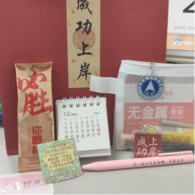 活动中,辅导员汪水兰老师介绍了每一份“小礼品”的寓意:小日历为你这段特殊日子倒计时;文具袋装满所有考场所需的文具;小卡片写满了每个人专属的祝福语……